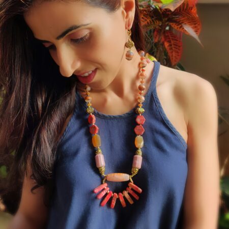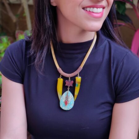 Add a splash of colour and fun to your day look with this unique, tropical, beach style statement necklace. It’s a one of a kind beauty that is sure to make you stand out from the crowd owing to its unusual design, vibrant colours and interesting play of materials!