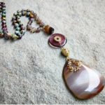 Long luxury boho mala necklace with gray stone and a chunky agate pendant with gold plated cubic zirconia crystal components.